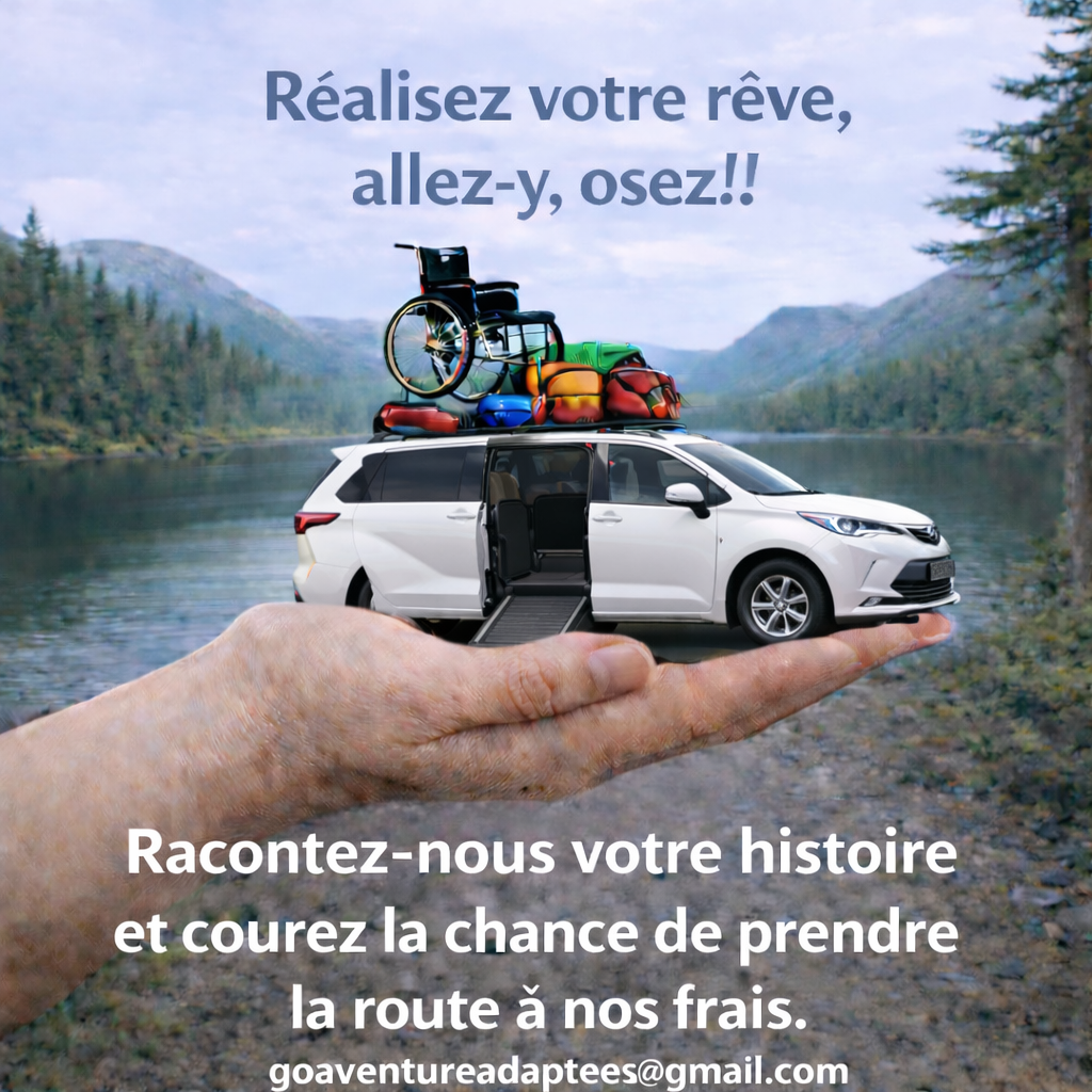 C’est pourquoi, une fois par année, en nous partageant votre histoire, un véhicule adapté sera offert gratuitement, essence comprise, afin de vous permettre de reprendre la route et vivre l’expérience de votre choix.